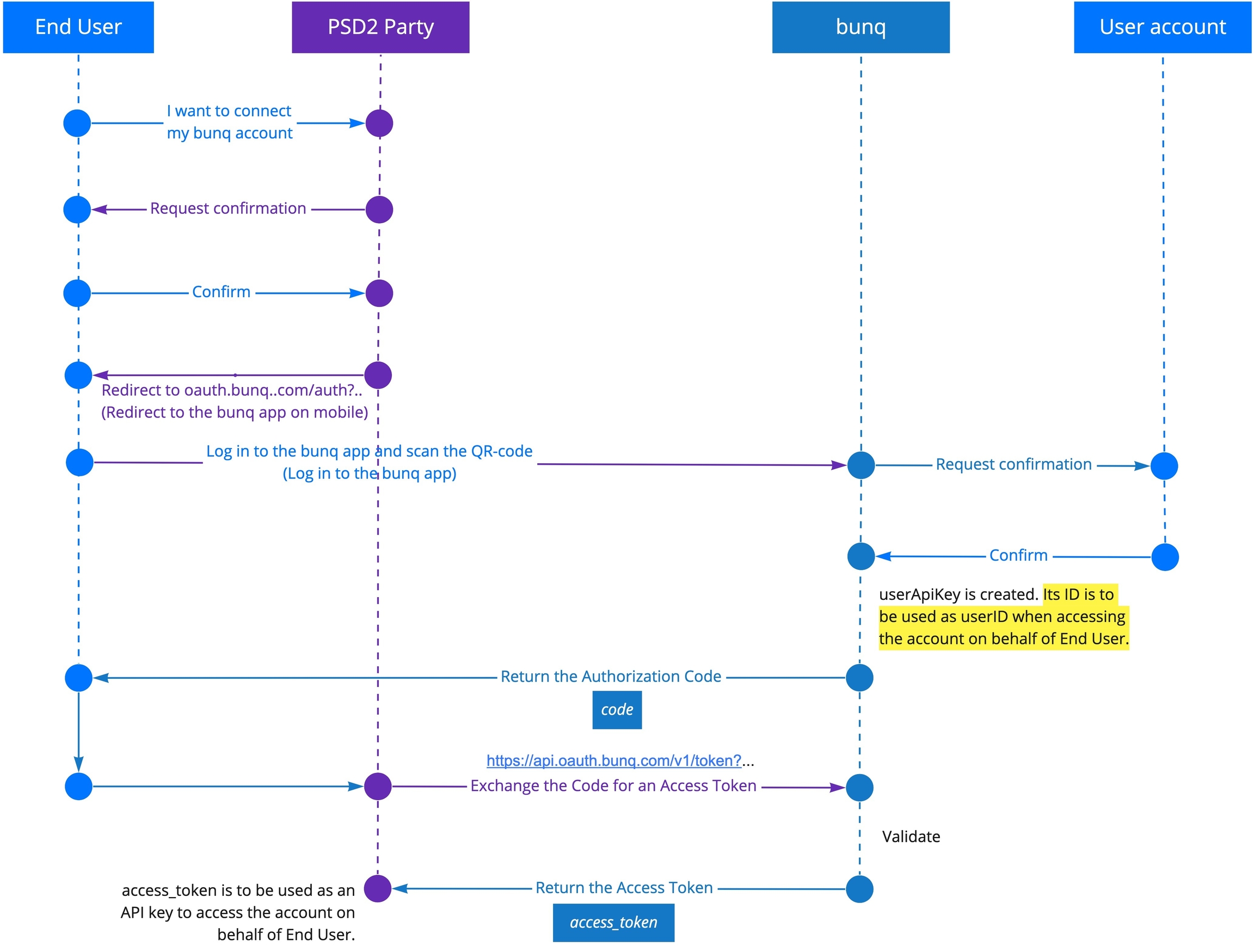 NOTE: When connecting to a bunq user's account using OAuth, you create a new user (userApiKey) that has its own id and access_token . When sending a request on behalf of a user connected to your app via OAuth, use the id of userApiKey as userId and the item ids of the bunq user (grantedByUser).