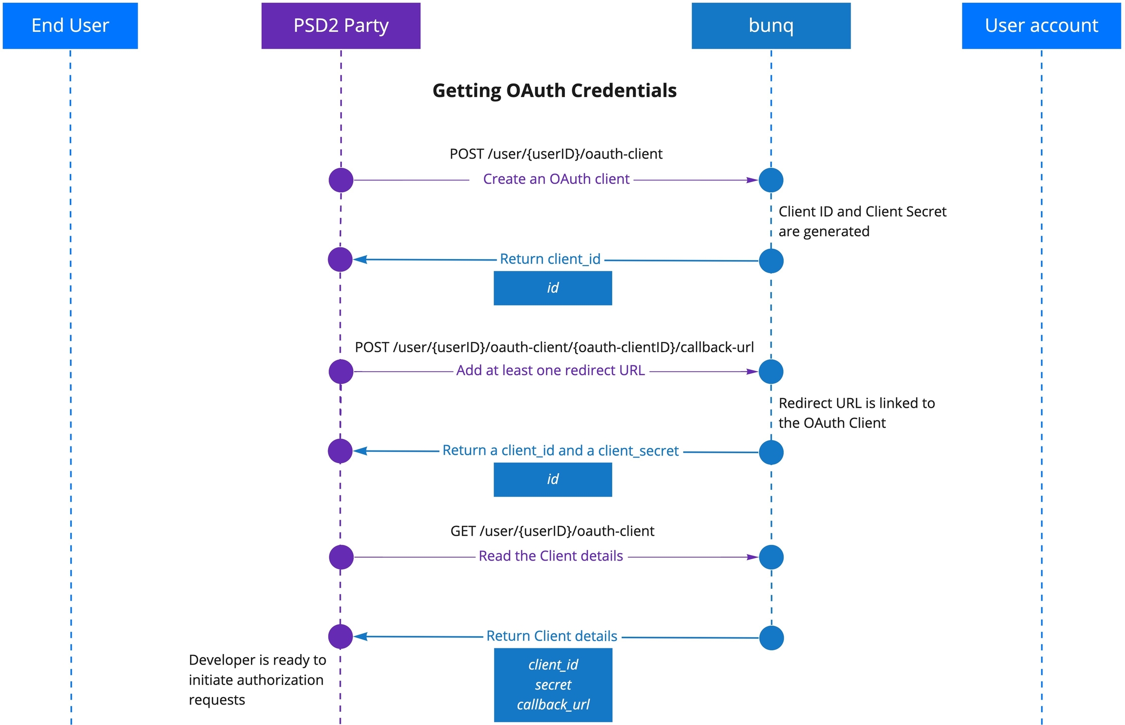 To initiate authorization into the bunq user accounts, you need to create an OAuth Client and register at least 1 redirect URL for it.
